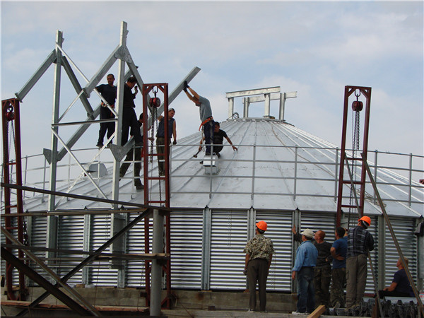 1、倉頂:由輻射狀的傘形鋼結(jié)構(gòu)支撐,倉頂骨架設(shè)計(jì)采用空間結(jié)構(gòu)技術(shù),可以保證大跨度設(shè)計(jì)載荷下的穩(wěn)定性,同時(shí)減小構(gòu)件的尺寸。倉頂板由鍍鋅板折彎制造,包括通風(fēng)窗,人孔,倉頂爬梯,倉頂護(hù)欄等