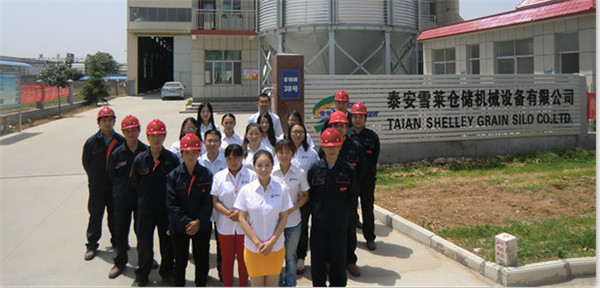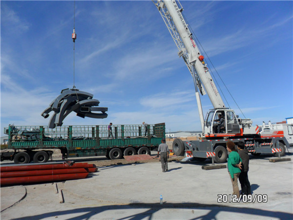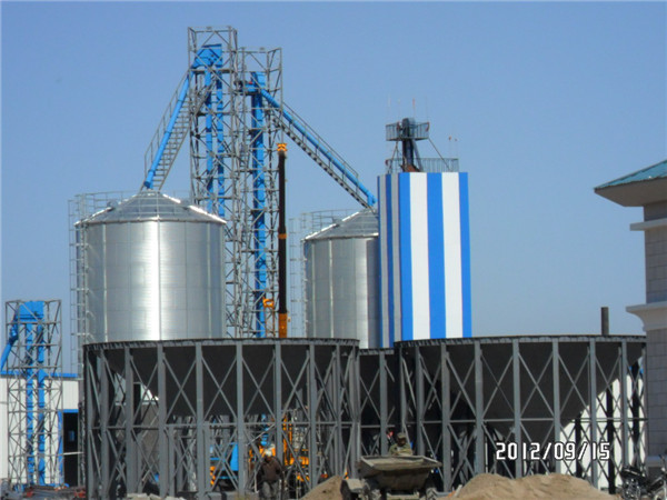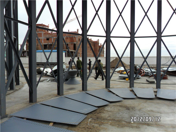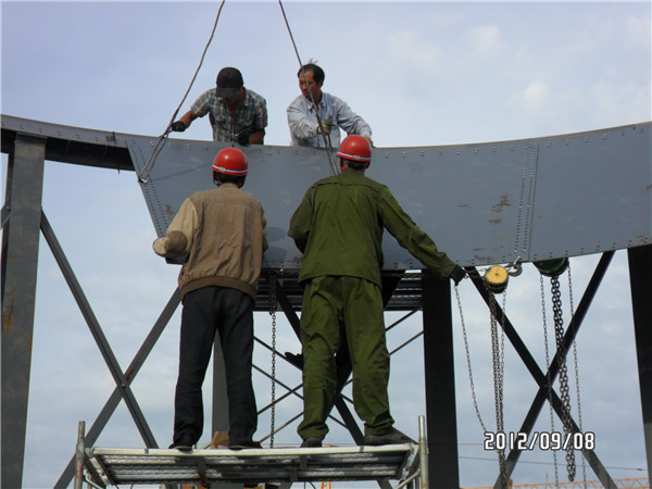 安裝時(shí),根據(jù)倉徑的大小,采用多個(gè)吊裝架,吊裝架上固定一個(gè)手動(dòng)葫蘆,使用特制的吊板用螺栓固定在倉壁墻板上,緩緩提升倉體。采取自上而下的安裝方式,即先安裝頂蓋、上層墻板,然后在裝中層墻板,再裝下層墻板,后將整個(gè)倉固定在基礎(chǔ)上。筒倉的構(gòu)件全部采用高強(qiáng)度螺栓連接,安裝方便、迅速、可靠。