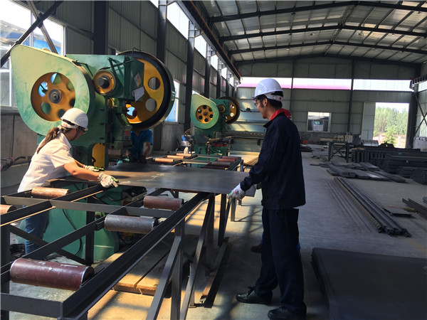 裝配式鋼板倉的倉體主要由壓型鋼板和z 型鋼立筋組成, 小倉、矮倉可以不設(shè)立筋或只設(shè)單筋( 每塊墻板對應(yīng)一根立筋) , 大倉、高倉必須設(shè)置雙筋且立筋壁厚要逐次加厚。壓型鋼板從上到下要逐次加厚, 壓型鋼板以卷板為原料采用輥壓法在工廠預(yù)制完成, 逐道輥壓一次成型, 波紋形成后再經(jīng)過沖孔工序、彎弧工序和鍍鋅工序等完成預(yù)制墻板工序, 包裝后運(yùn)往倉庫或現(xiàn)場進(jìn)行安裝。