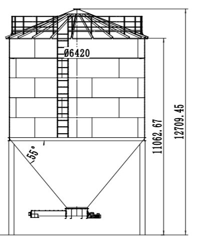 容積:196m3 直徑: 6.4m 倉檐高:5.6m 總高:7.2m 錐頂角: 25。 倉頂蓋板為δ1.0mm熱鍍鋅板,選用國產優質熱鍍鋅板,倉頂上設置自然通風窗、人孔、爬梯,倉頂用航空膠泥和防水墊圈密封,沿倉檐四周設有安全防護欄。