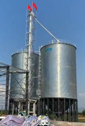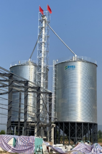 2臺1000噸存儲小麥/玉米的全鋼錐底鋼板倉一字排開,塔架設置在兩倉中心位置,提升機將糧食輸送到雙筒初清篩中,經過初清篩將糧食中的大雜和小于分離出去,再經提升機輸送到頂部配合電動三通,將糧食輸送到不同的鋼板倉中,倉內設有通風和測溫裝置,可以實時檢測倉內糧食溫度和濕度變化,達到安全儲糧的作用。當糧食出倉時,倉底刮板機,將糧食輸送到指定位置。