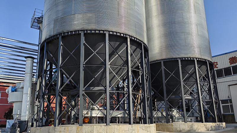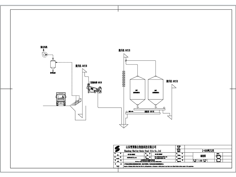設計工藝簡介:本項目設計包括2臺φ8.2m,倉容600T鍍鋅裝配式全鋼錐底鋼板倉、3臺50/28型時產量50-60噸斗式提升機、3條TGSS25型時產量50-60噸刮板機、1臺可篩分小麥和玉米雜質的三層振動清理篩(帶風選設備)及整套除塵設備、通風測溫設備和雙電控柜系統,實現了客戶散裝玉米、散裝小麥存儲的機械化、電動化,當現場來料為玉米時,散裝車可直接將散裝玉米投入現場卸糧坑,由提升機將玉米提升至三層振動篩,振動篩將玉米中的大雜質、小雜質顆粒篩除,干凈的玉米經過磁選器進入筒倉內部儲存,用戶可根據玉米儲存的時間,選擇定期檢測倉內溫度變化、當倉內溫濕度過高,則溫濕度數據通過電控柜控制面板報警,客戶可選擇打開倉底通風設備進行降溫處理,還可通過為客戶設計的倒倉功能,開啟倒倉刮板,將1號倉存糧導入2號倉,保證糧食儲存的時間和質量,避免霉變和結塊的發生。
